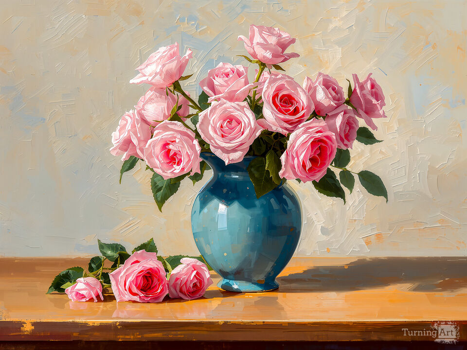 A blue vase holds a lush bouquet of pink roses on a wooden table. A few roses are artistically placed around the vase. Created with AI plus other digital editing in an impressionist painting style.