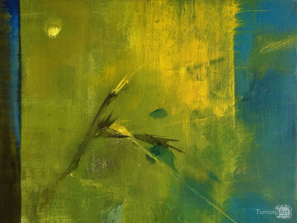 A new growth in nature seems to happen secretly when no one's present. While the color exudes the energy of life, the atmosphere is calm and tranquil. I imagined a whisper of moon-light delivering a new bud when painting this piece.
