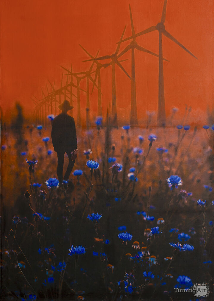 The landscape art with a story ‘BLUETS’ is a mixed media painting about the interaction between humanity, nature and the evolving technological landscape.