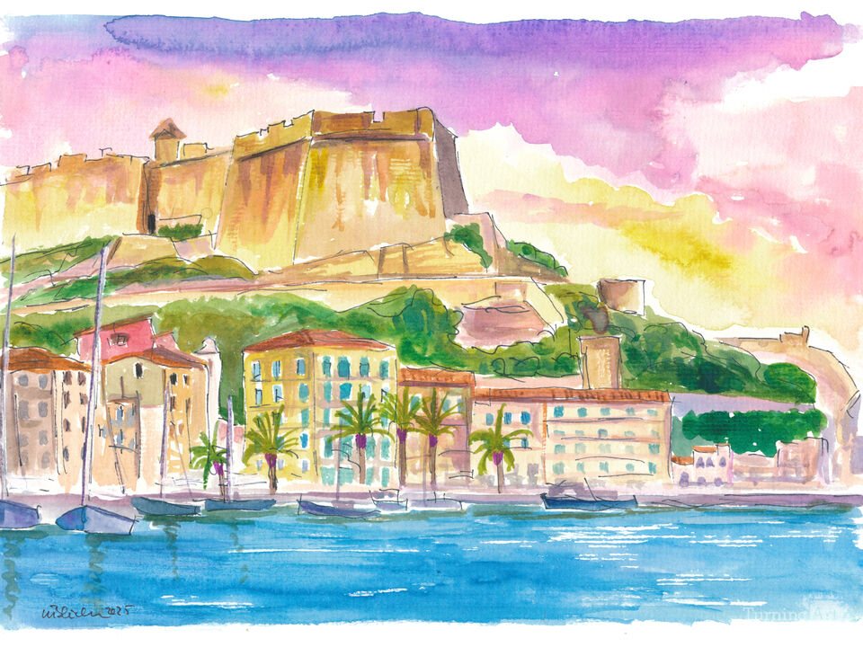 Bonifacio Cliffs Corsica – Dramatic Limestone Cliffs with Historic Town & Sea View | Mediterranean Coastal Illustration Travel Wall Art
