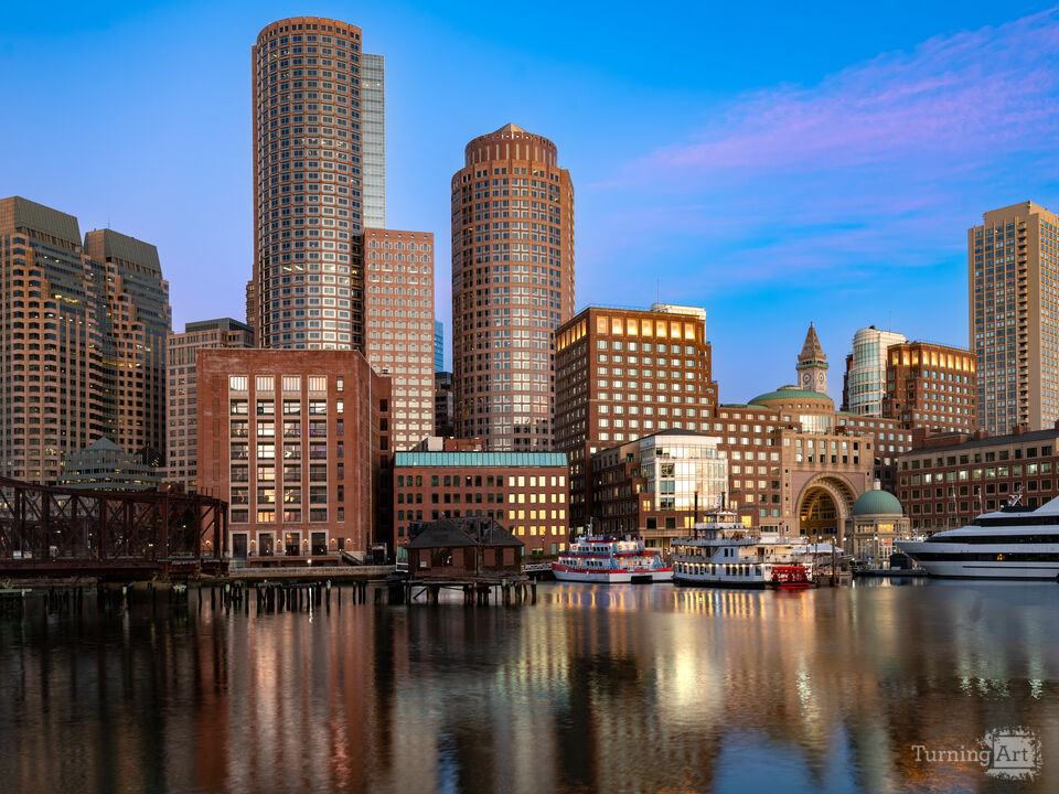 A stunning view of the Boston downtown skyline at twilight, seen across the water from the Seaport District, with brightly lit towers and colorful reflections.