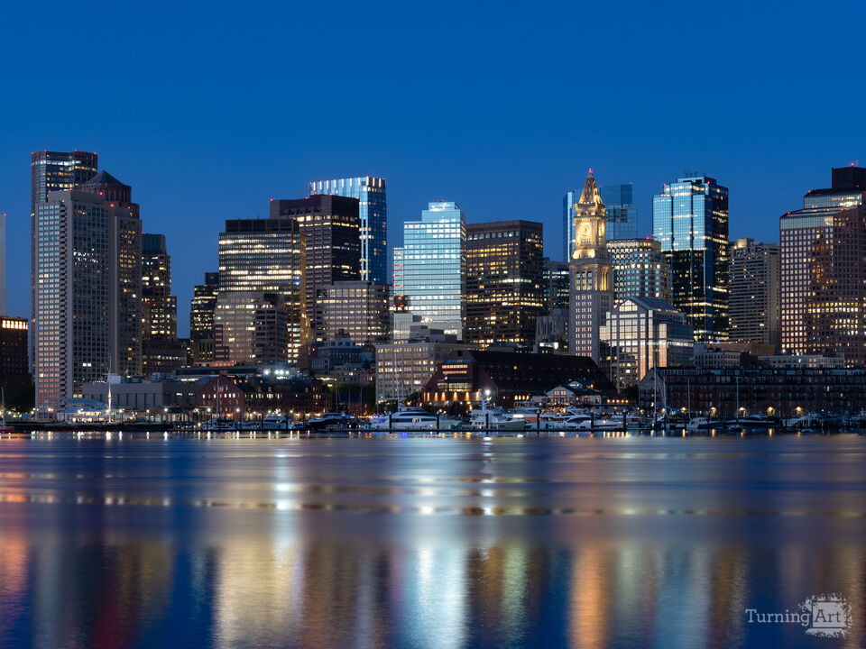 A beautiful sunrise view of the Boston downtown skyline, seen from East Boston across the harbor, with the Custom House tower and illuminated high rises.