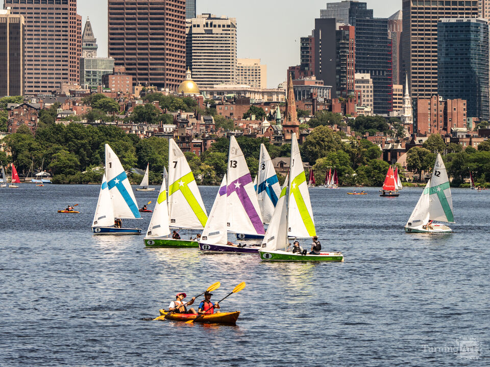 Boston's Charles River Basin is the primary location for university sailboat races and regattas. I spend hours every spring and summer, sitting on the Cambridge side of the river, waiting for interesting sailboat groupings—an occasional kayaker too—against the Back Bay and Beacon Hill skylines.