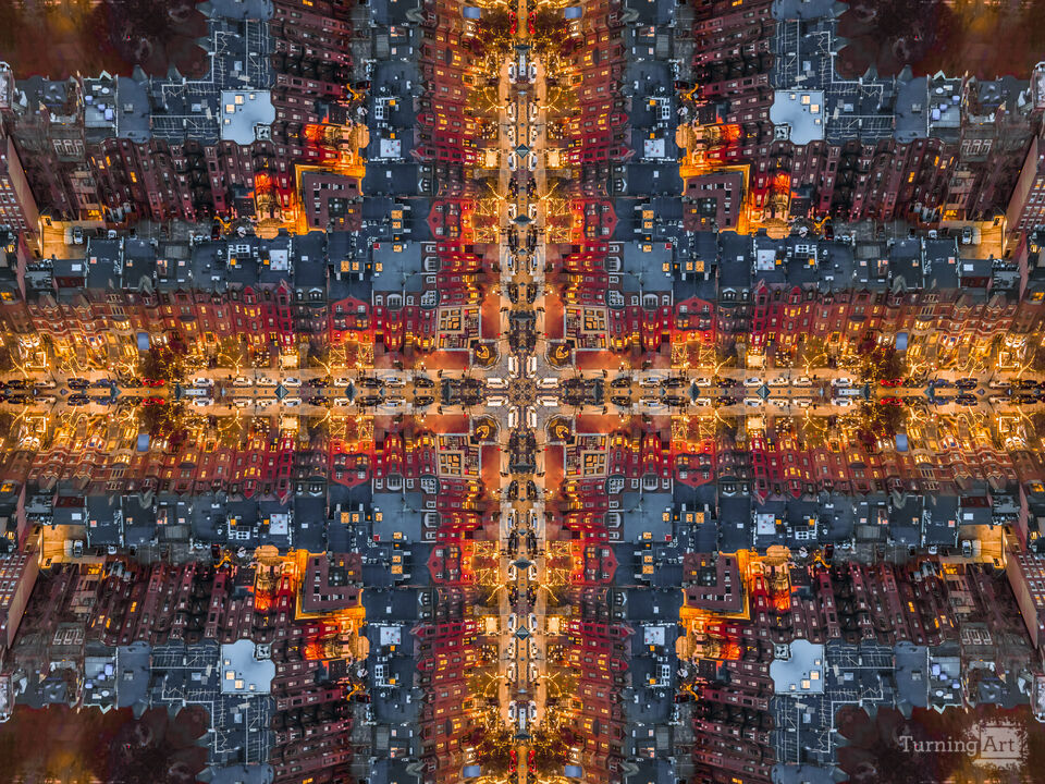 Mirror image of old buildings and streets in Boston, MA, at dusk. The repeating architectural details of the buildings form a beautiful abstract pattern.