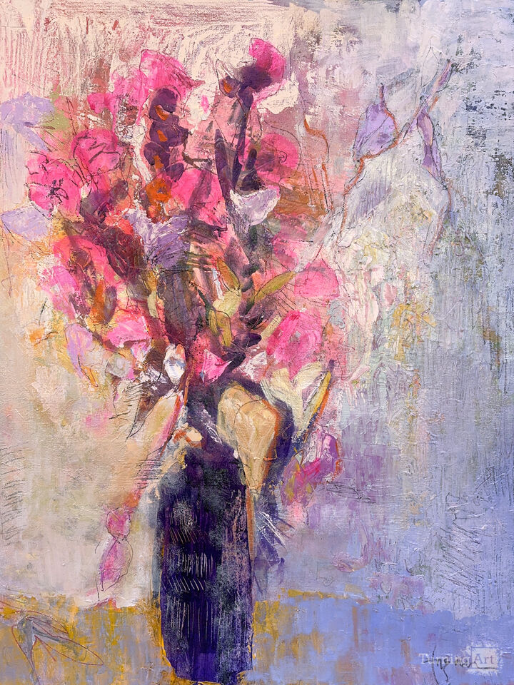 With a trowel-size palette knife and willow twigs, Dorothy Fagan expresses the rejuvenating relationship with her beloved garden by the pond. Each painting begins in the garden as deep emotional colors stroke passions with thick impasto paint. As her botanical essences take form, the artist’s hand draws automatic writing from earth spirit with willow charcoal.