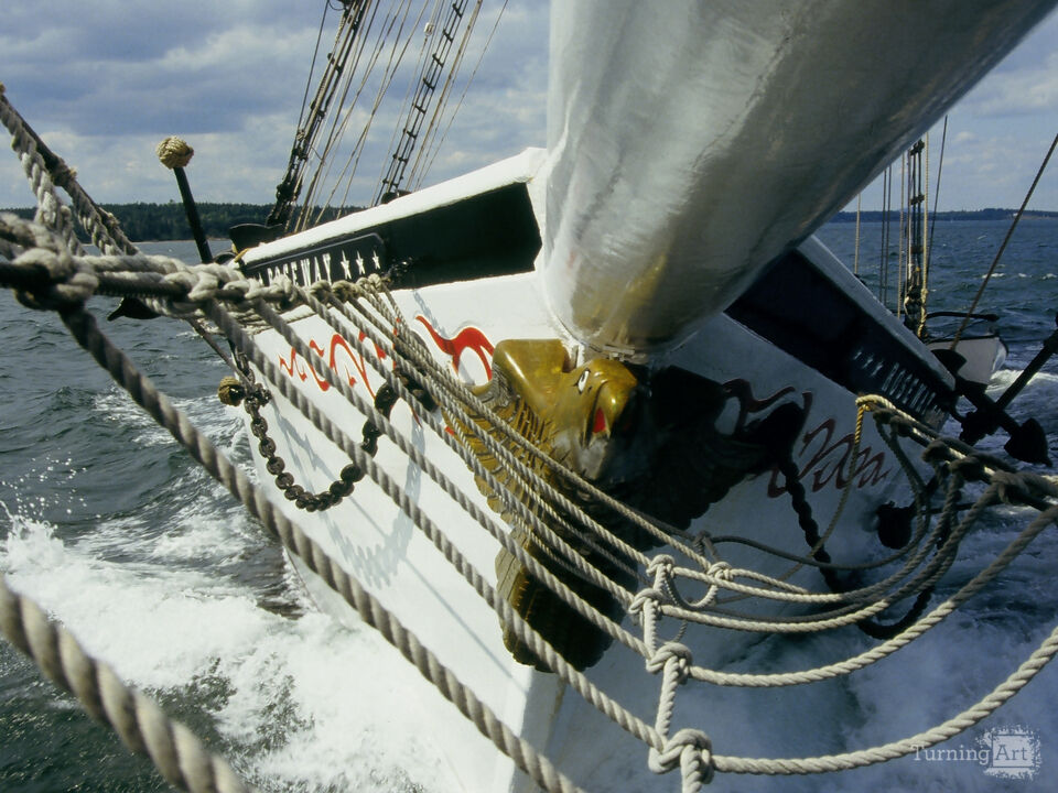 The bowsprit and rigging of the schooner Roseway stretch forward over open ocean as the vessel cuts through rolling waves. Lines, stays, and sails form an intricate web that reflects the craftsmanship of traditional sailing ships. Built in 1925, Roseway once worked as a Gloucester fishing schooner before becoming a sail training vessel. The perspective from the bow highlights both the power and grace of the ship under sail. Ocean spray and moving water emphasize the vessel’s forward motion. The image captures the spirit of classic seamanship and life at sea.