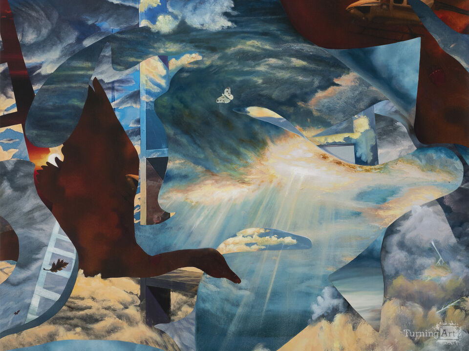 My aesthetic visualization of some such possibilities as paintings were inspired by reading about quantum loop theory in the books of Carlo Rovelli, including “The Order of Time” and “Reality is Not What it Seems.” In the series multiple versions of the same sky or multiple different skies are depicted within one image, suggesting that multiple understandings of reality could be simultaneously valid.