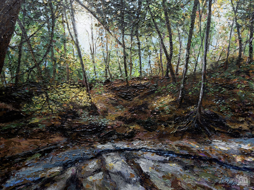 Inspired of a fall trip to Dundee Falls, a park in Ohio. I was standing on the top of the falls where before me was only a tiny stream of water that led to a 15 foot drop to the left of the view I chose. The light breaking through was arresting however; on this breezy autumn day, and caught my undivided attention.
