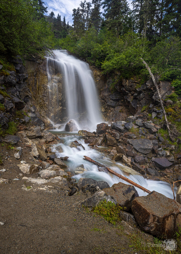 The Bridal Veil Falls flows gracefully over rocky cliffs near Skagway, AK. Framed by lush green trees under a partly cloudy sky. The water creates a gentle mist as it tumbles into a serene pool below, surrounded by rocks. The scene evokes a sense of tranquility and untouched natural beauty.