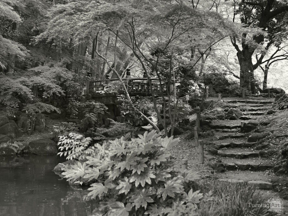The serenity of a path in the park! Ancient stone steps leading to a graceful bridge. The walk and vision of peace in a country setting.