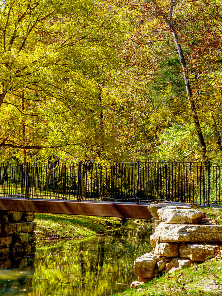 A bold and beautiful autumn season afternoon with colorful trees of golden yellows and oranges brighten the landscape along Dogwood Creek in Lampe, Missouri, USA. A small walkway bridge with iron rails, crosses over the creek as the water mirrors the trees. You can almost feel the breeze as you enjoy the peaceful Ozarks nature scene. This is in Dogwood Canyon just west of Branson, MO.