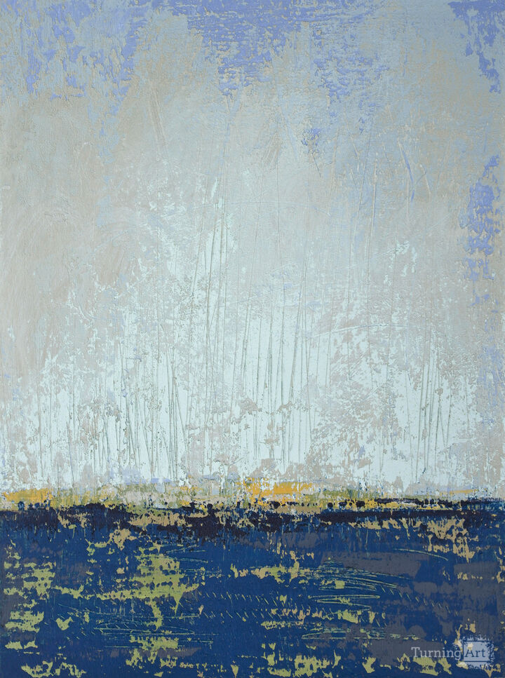 "Broken Rules" harmonizes cool blues and greens with warm ochre, creating a serene and textured composition. Gentle horizontal layers and subtle vertical lines establish a soothing natural rhythm, offering a peaceful escape in minimalist form. Designed to enhance any space, this artwork fosters reflection and cultivates a tranquil atmosphere that promotes relaxation and well-being.