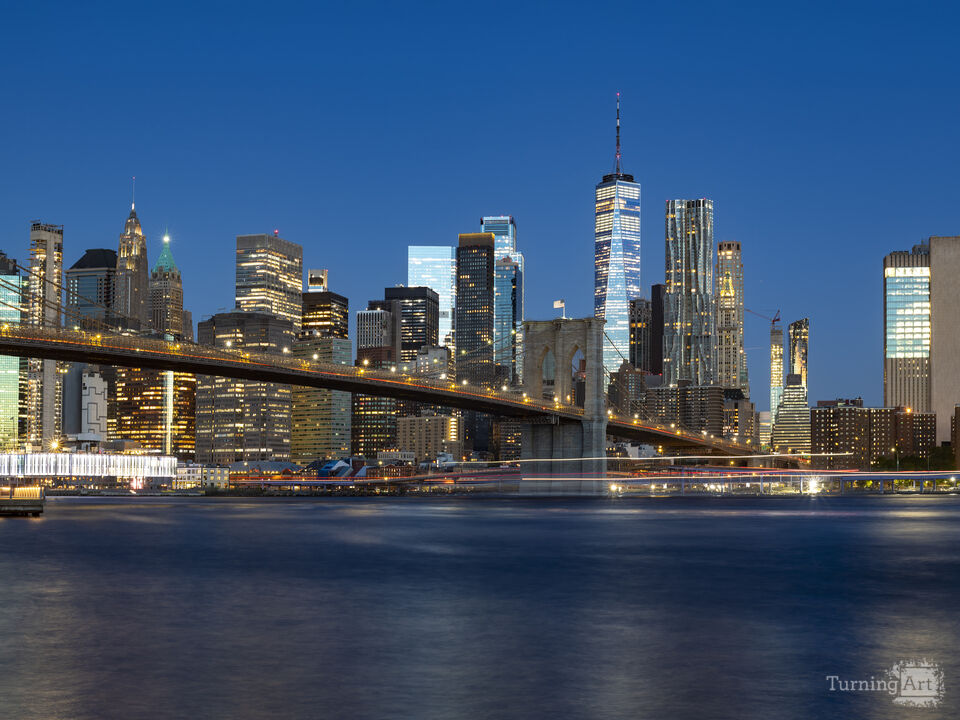 A panoramic view of the New York City waterfront at dawn, featuring the brilliantly lit Downtown skyline and the historic Brooklyn Bridge infrastructure.