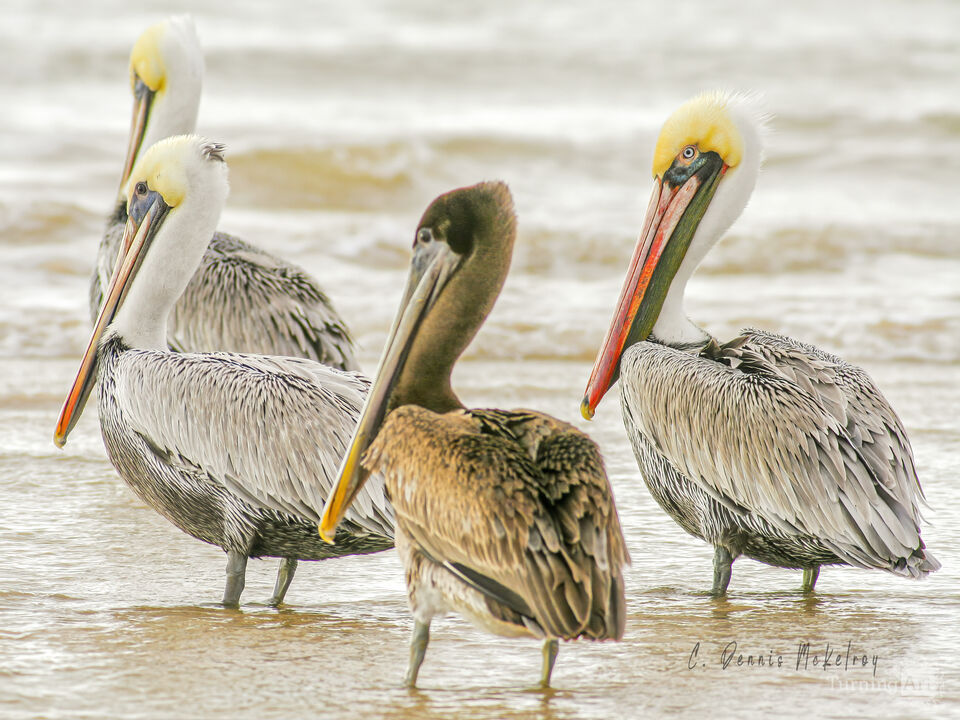 This group of brown pelicans look to be a family group with several young ones. They will start to develop their coloring as the mature. Brown pelicans were on the endangered spices list not to long ago. They have since rebounded with the introduction of birds brought in from other locations around the states.