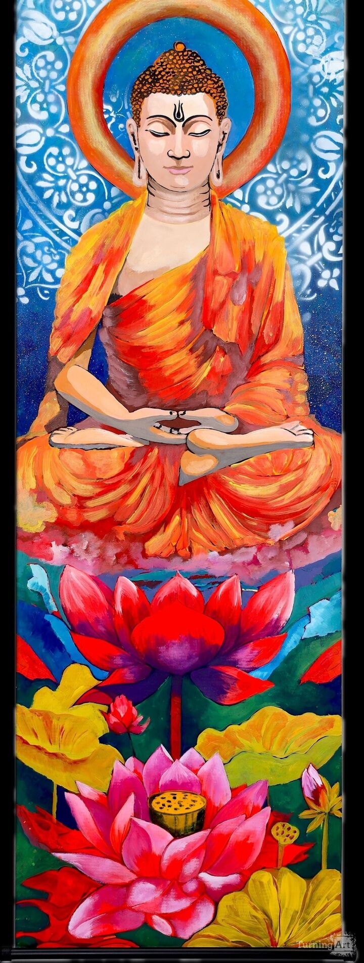 Painted on a large 15.7 × 47.2 inch scrolled canvas in an elegant tapestry style, this piece seamlessly blends fine art with spiritual symbolism. It makes a powerful statement in any space — ideal for creating a calming, centered atmosphere in your home, studio, or meditation room.