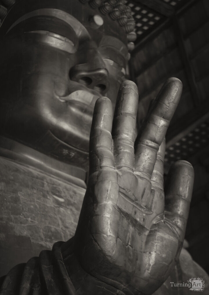 Before there was Kyoto, Nara was the ancient imperial capital of Japan. The giant statue of Buddha is found in a temple in Nara, shown here with a hand raised to share the light with us puny mortals.