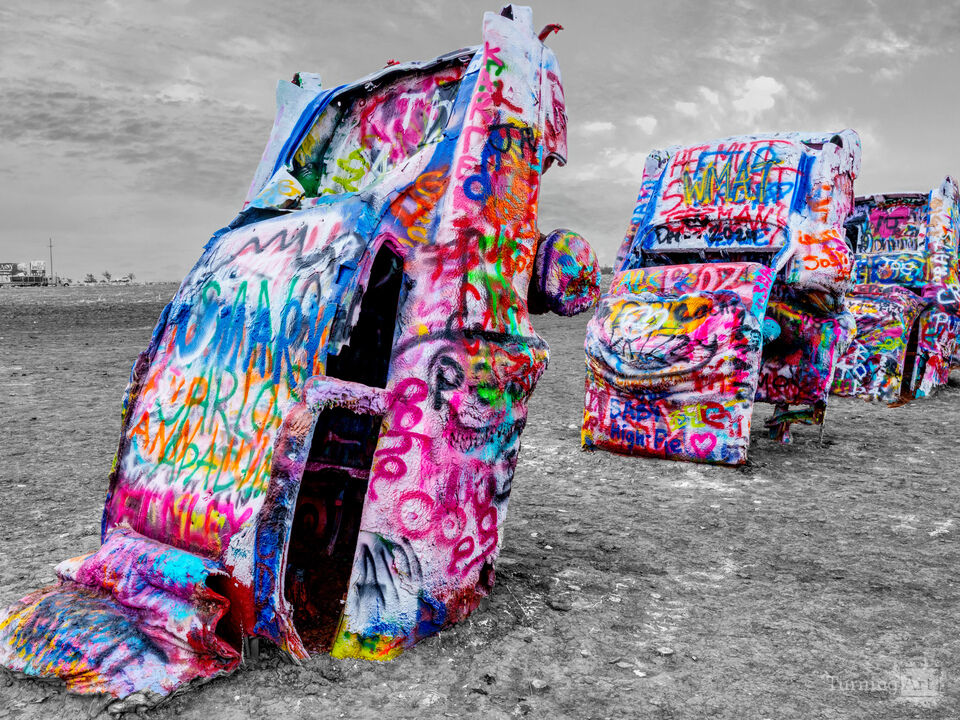 This selective color image offers yet another dynamic glimpse of Cadillac Ranch, where art, history, and self-expression collide along the open plains of Texas in Amarillo. The vintage Cadillacs, buried hood-down in the ground, stand in a staggered line with their tailfins rising toward the sky, each one coated in thick, overlapping layers of spray paint. Installed in 1974, the cars, ranging from 1949 to 1963 models, have become a constantly changing canvas shaped by travelers passing through the Texas Panhandle. The cars are in color while the landscape is in black and white.