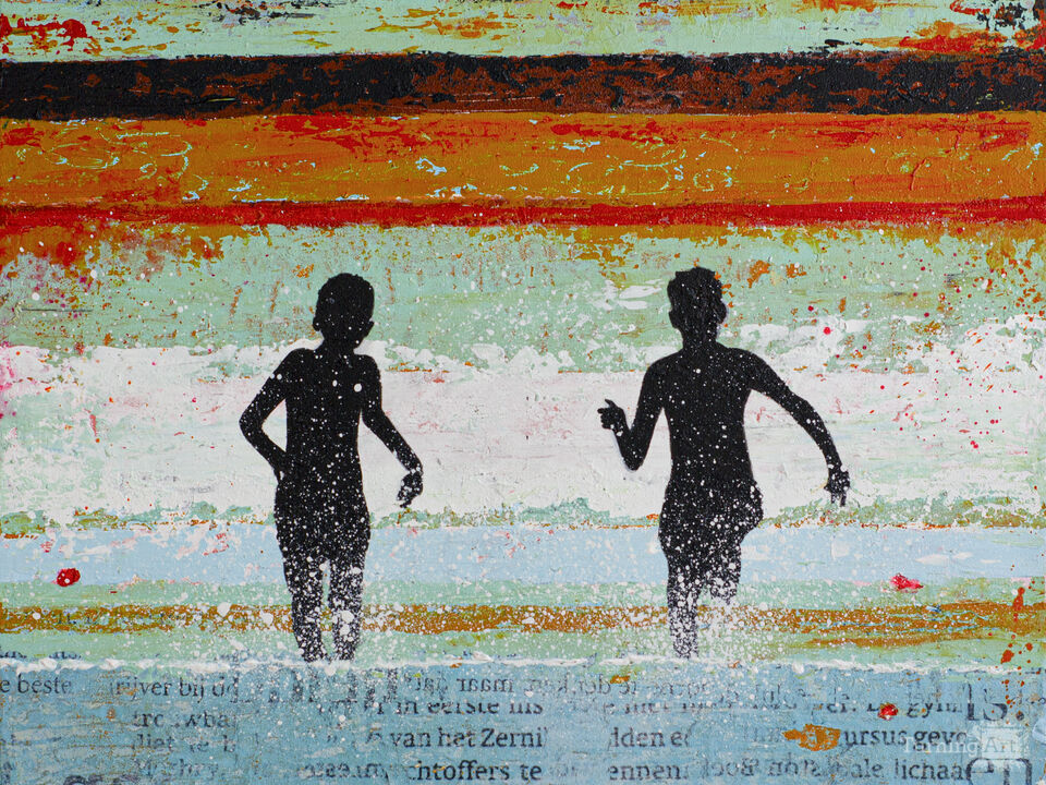 This mixed media street art work ‘CAREFREE’, depicts two boys running into the sea together. Their figures are simple silhouettes, emphasising the purity of the moment.