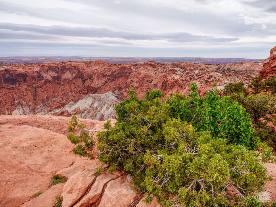 A large cedar bush clings to a rocky ledge along the bluff at Upheaval Dome in Canyonlands National Park, just outside Moab, Utah, USA. Under overcast skies, soft, muted light and faint purple tones spread across the scene, lending a quiet, mysterious mood to the rugged desert landscape. Surrounded by steep canyon walls and layers of richly colored sandstone, Upheaval Dome stands as one of the park’s most intriguing geological features. Scientists continue to debate whether its dramatic form was created by a meteorite impact or pushed upward by a massive salt dome deep beneath the surface. Located within the Island in the Sky District, this remarkable viewpoint is a memorable stop for hikers, photographers, and anyone exploring Utah’s red rock country.