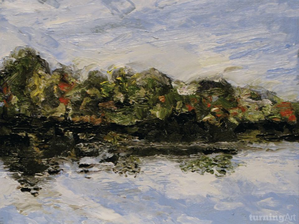A splash of clouds rushes across the sky and is reflected in the river below. Trees on the opposite shore are beginning to show signs of autumn color. To be capable of communicating anything meaningful to the viewer, a painting must be the record of a 'conversation' between the painting and the painter.
