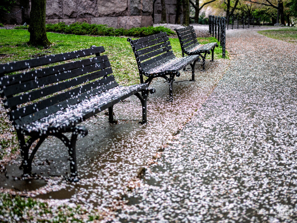 Cherry Blossom Benches on a rainy morning, Tidal Basin, Washington, D.C. Color photograph showing three park benches in a row, with a path covered in fallen petals. 2024.
