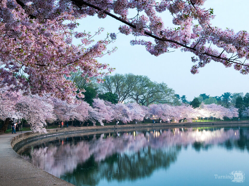 Cherry blossom trees a few days after peak bloom in predawn light, Tidal Basin, Washington, D.C. Color photograph showing the trees lining the water, with their reflections visible. 2012.