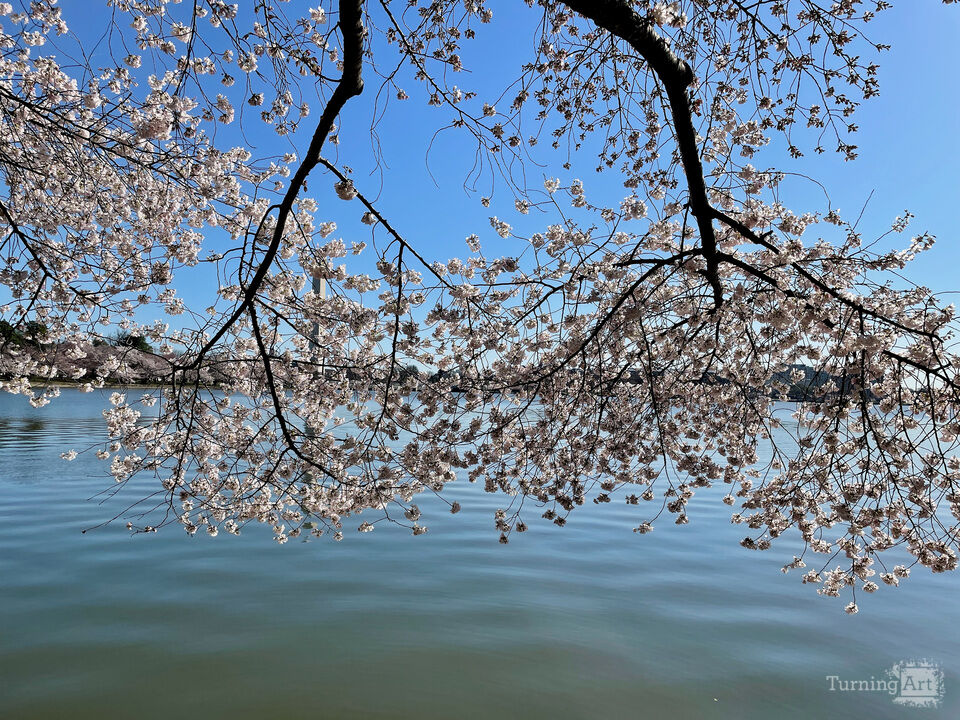 Washington D.C. is known for the blooming of its Cherry Blossoms. Here, boughs hang over tranquil water under a clear blue sky. This piece will bring charm to any space.