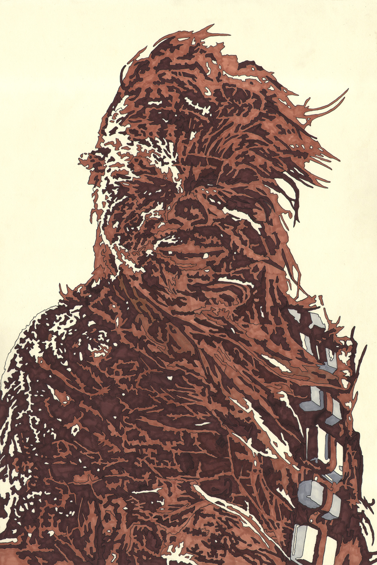 Chewbacca is a permanent marker drawing on paper, a detailed preparation sketch for a painting, depicting a still from The Empire Strikes Back. I paint and draw the way my memory stores and replicates things in an inaccurate, personal way. In my work, erasure, fragmentation and simplification represent the imperfect, limited nature of memory and the constant notion of flux in the physical and digital world. I want to replicate the transitional state between the past and the unknown and focus on the idea of being in a perpetual state of potential.