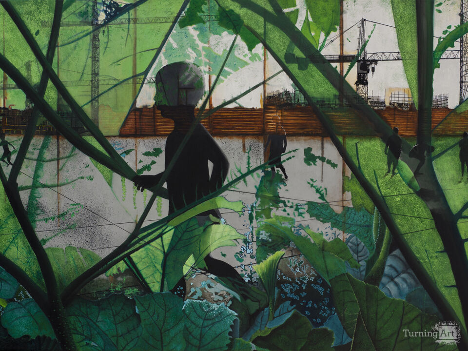 Nature, although oppressed, refuses to disappear. In the foreground, large leaves are a testament to the enduring spirit of the natural world.