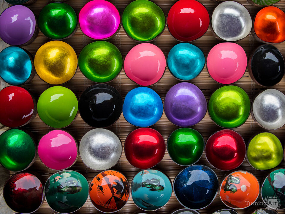 In this companion piece Circles Of Southeast Asia I, rows of lacquered coconut shell bowls are arranged in a perfect grid, each one a single saturated, glossy color — magenta, gold, chartreuse, teal, purple, red, black, pink, silver, and more. The absence of decorative motifs places all visual emphasis on pure color and form, transforming a market display into something that approaches a Color Field painting or a designer's swatch board. The reflective lacquer surfaces catch the light differently in each bowl, adding depth and variation to what might otherwise be a flat graphic. This is an enormously joyful, energetic image that brings an immediate burst of color to any space.