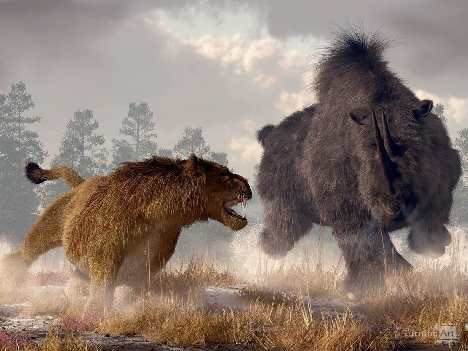 Two of the most fearsome creatures of ice age Europe are having it out. A rogue male cave lion (panthera leo spelaea) has wandered too close to a grazing woolly rhino (coelodonta antiquitatis). Much like what happens when the modern rhinoceros and lion cross paths, a confrontation occurs. Kicking up snow and rocks, the rhino charges the lion while the great cat attempts to circle behind the thundering behemoth. It's a prehistoric battle between two of the mightiest Pleistocene animals.