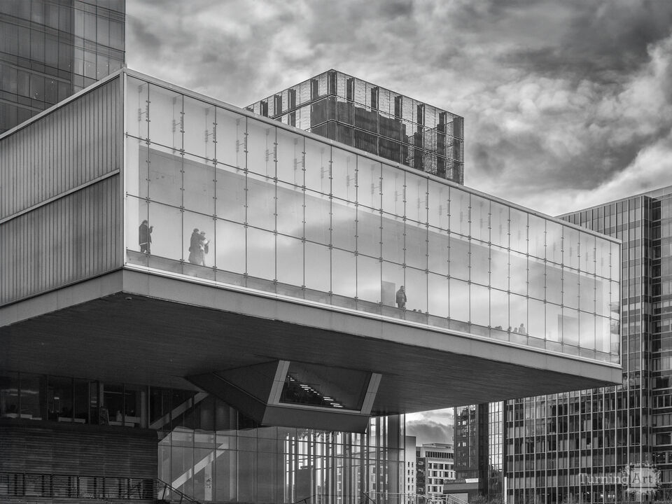 Boston's iconic Museum of Contemporary Art hangs off the Boston Harbor waterfront. Viewed from the harbor side, the glass walls of the museum reflecting the overhead clouds appeared to capture museum goers. The irregular cloud shapes formed a sharp contrast with the adjacent architecture.