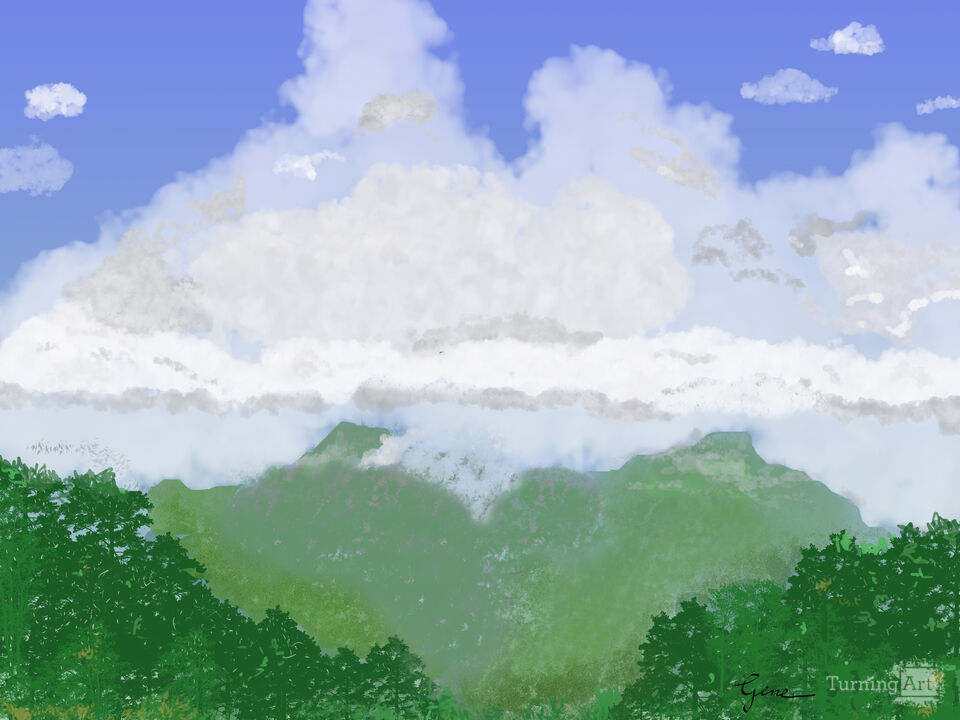 The use of soft, blended brushstrokes contributes greatly to the peaceful mood of the piece. This technique suggests a gentle, almost dreamlike quality, reinforcing the misty atmosphere and the subtle transitions between land, haze, and sky. The color palette—particularly the varied greens and muted tones of the mist—suggests a sensitivity to nature’s palette, evoking both vitality and calm. The clouds, with their fluffy whites and gentle greys, add a dynamic balance to the stillness of the landscape without overwhelming the composition.