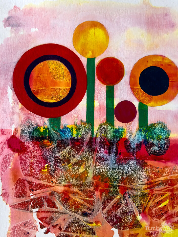 These dandelion puffs are waiting for the next breath of wind to send them twirling high into the sky. They will leave a swirl of patterns behind. The watercolors pirouette with light and texture.