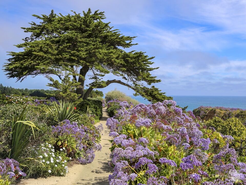 Spring time along the bluffs in coastal town of Del Mar, California is a favorite time to view blooming purple statice and other wildflowers native to Southern California. This foot path overlooks the Pacific Ocean providing a breathtaking scenic landscape enriched by spring colors. The windswept tree anchors the composition of this photographic image.