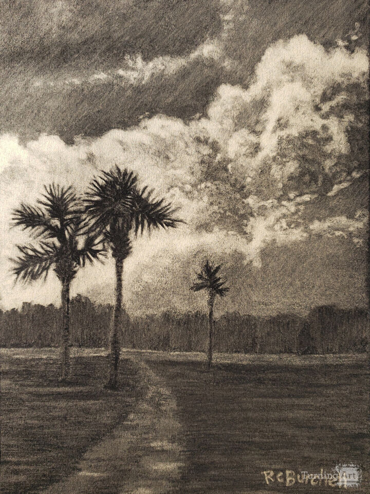 During a camping trip to southern Florida, I began this reductive charcoal. Such a wonderful, mild, balmy morning, with just a hint of a breeze. I love camping.