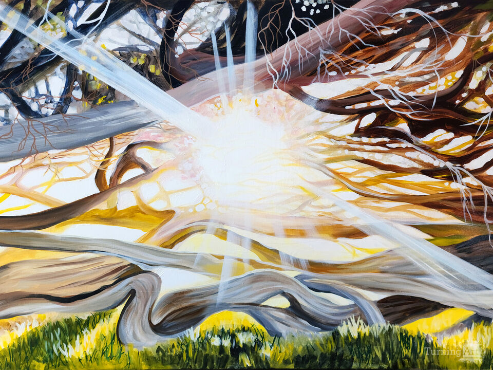 It is a dramatic image, with the branches at the top deep in dark shadow, and the ones at the bottom illuminated in golden light. The shafts of sunlight bursting through the center of the canvas reach diagonally almost from corner to corner.