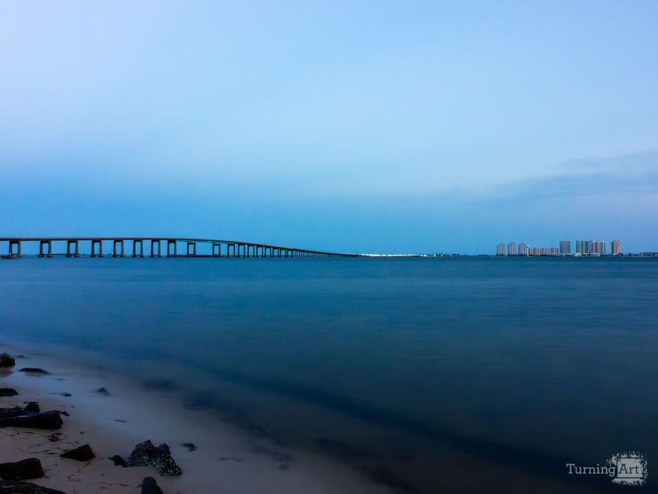 After sunset, blue hour settles in and bathes the coastal scene in rich cobalt tones as gentle water swishes along the shoreline of the Santa Rosa Sound. The Navarre Beach skyline glows softly in the distance, with the Navarre Beach Causeway Bridge stretching across the waterway as a quiet focal point.
