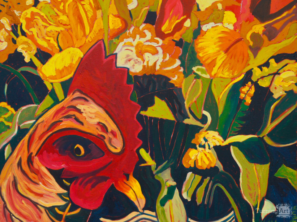 Haitian and Navajo roosters dot our kitchen. This Haitian beauty caught the bright sun from the skylight while standing in front of a farmers market