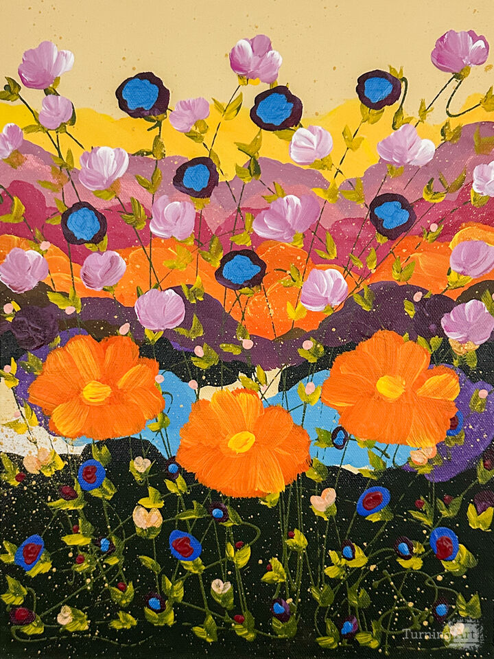 In this piece, I embraced the vibrancy of nature's symphony through bold acrylic strokes. The lively orange blooms burst with energy amidst the delicate pink and blue blossoms, symbolizing growth and joy. This painting captures the feeling of a radiant morning, radiating warmth and renewal. Bringing it into your space will infuse it with uplifting, dynamic vitality and a celebration of life’s colorful rhythms.
