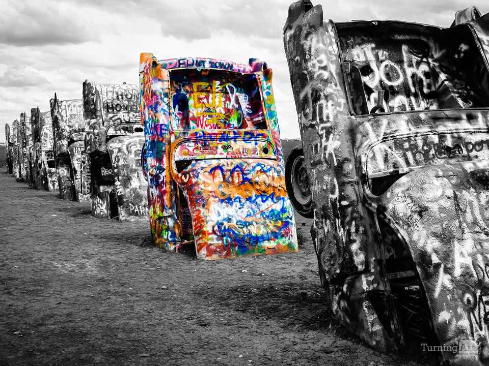 Pop of colorful graffiti on a vintage Caddie. Cadillac Ranch Amarillo, Texas photo by Sonja Quintero.