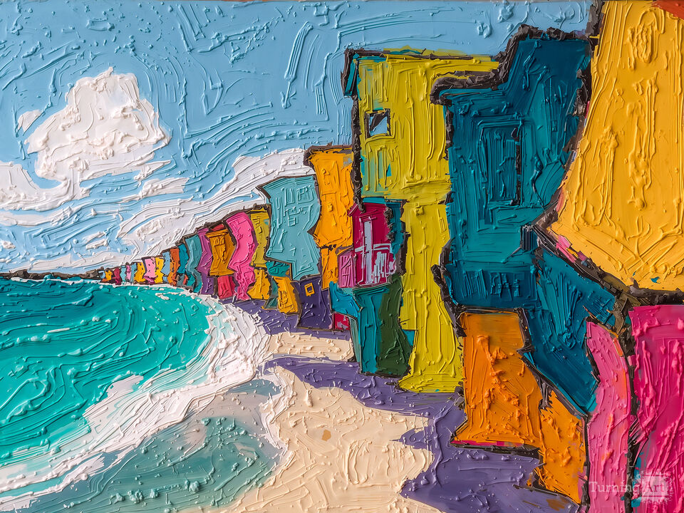 Brightly colored houses line a beach under a clear sky. The ocean waves gently lap against the shore, enhancing the vibrant scene. Created with AI plus other digital editing in an expressionist painting style.