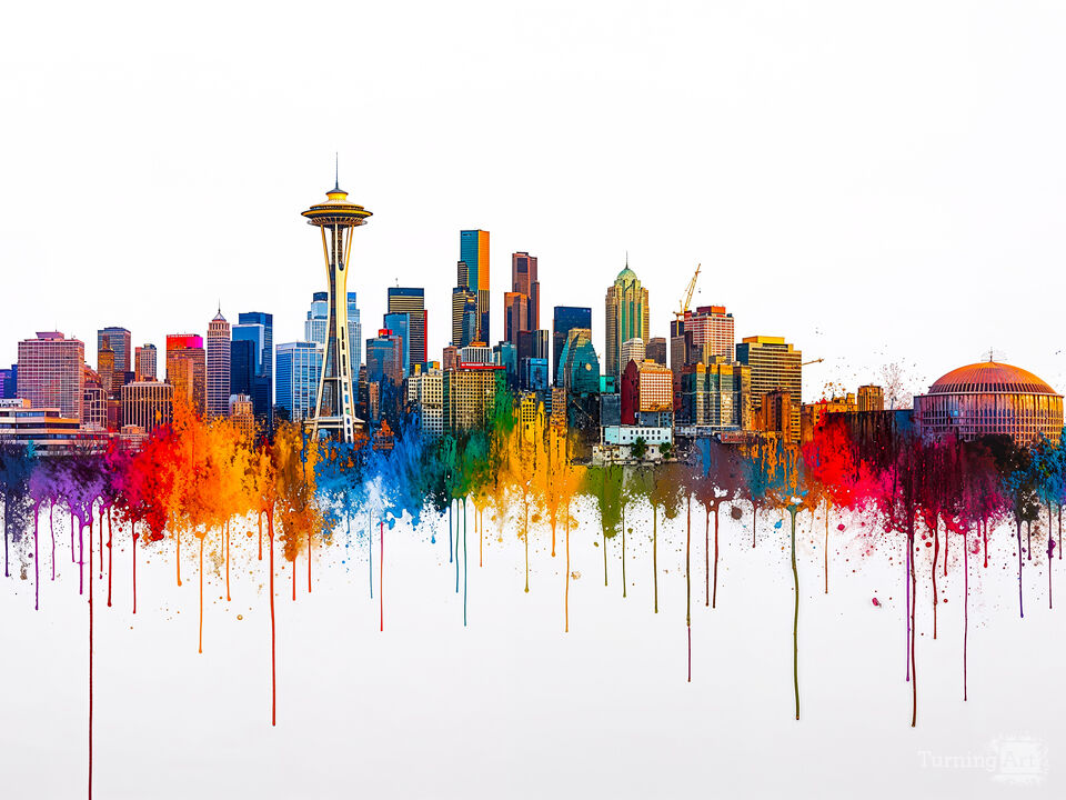 A vibrant depiction of a skyline blends urban architecture with a splash of rainbow colors. The iconic Space Needle stands out among the other skyscrapers. Created with Ai and additional digital editing in a modern painting style reimagining the Seattle, Washington skyline.