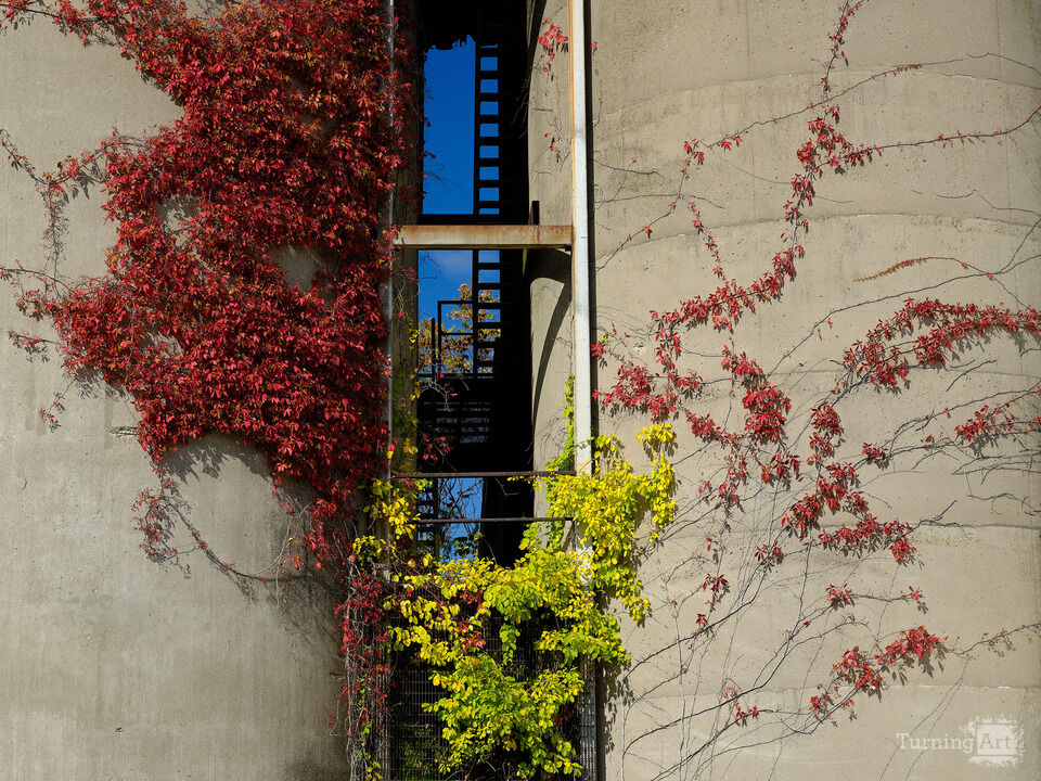 Colorful vines in yellows and reds growing on the empty grain storage tanks of the abandoned Sodus Point Old Malt (Genesis) Factory on Lake Ontario NY