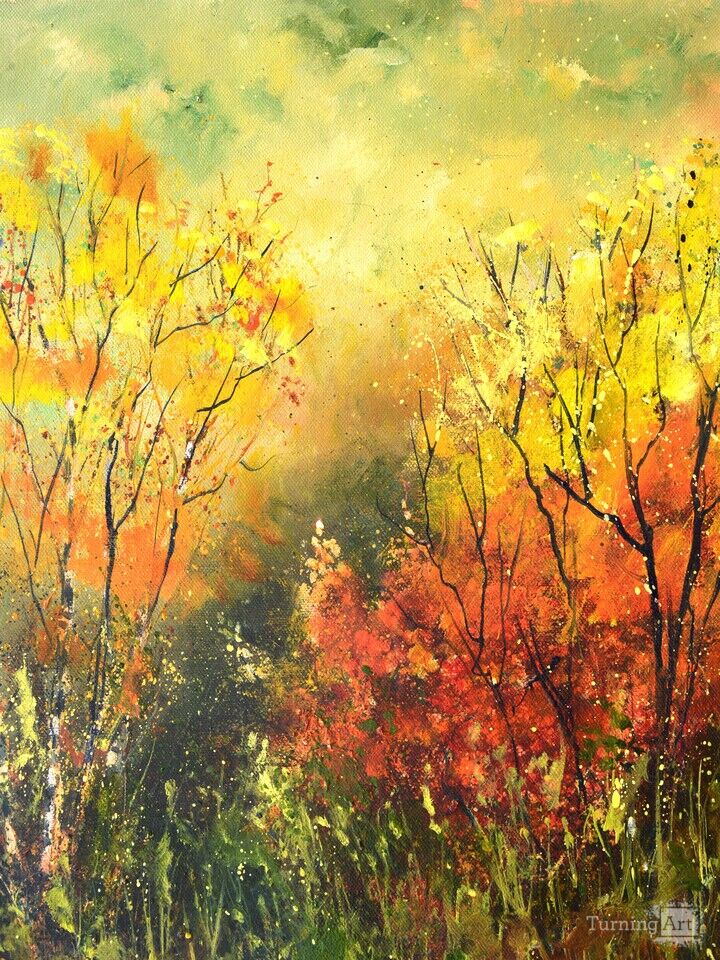 This vibrant painting captures the fleeting beauty of autumn, where fiery reds and golden yellows burst through the foliage like nature’s final celebration before winter. The expressive brushstrokes and splattered textures evoke a sense of motion, as if the trees are dancing in a soft, glowing breeze. It's a stunning tribute to the season's