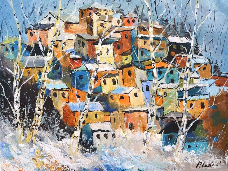 This captivating work depicts a picturesque village nestled in the heart of a winter landscape. The snow-covered houses are painted in warm shades of red, orange, and blue, creating a striking contrast with the icy blue sky. The white birch trunks in the foreground add a graphic dimension to the composition, creating visual harmony. Each house seems to tell a story, with its small, mysterious windows. The artist uses bold brushstrokes, lending a dynamic texture to the whole. The interplay of vibrant colors illuminates the scene and evokes a warm atmosphere despite the surrounding snow. This painting offers a fascinating exploration of the contrasting coexistence of human habitation and the wilderness in winter. It is a vibrant and vivid testament to the unique aesthetic of a village in this cold season.