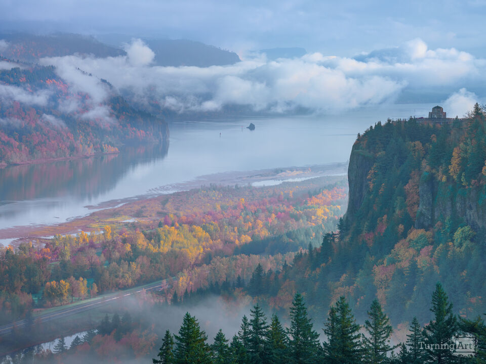Early morning fog over the Columbia River and Vista House with autumn colors as seen from the Portland Women's Forum State Scenic Viewpoint in the Columbia River Gorge, Oregon.