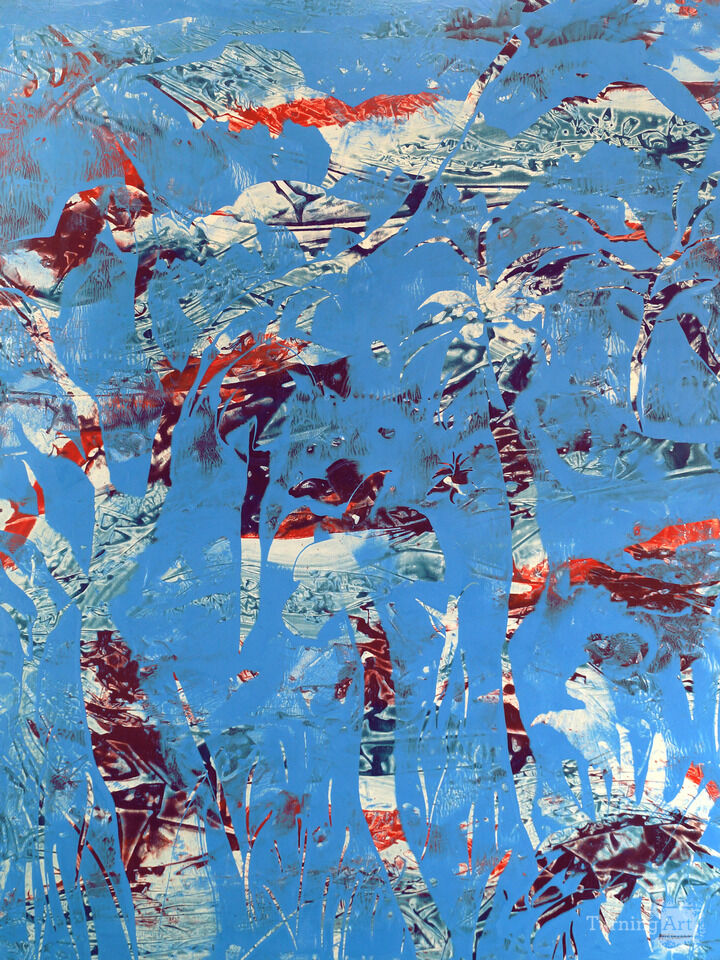 Community Spirit is a large original biomorphic abstract expressionistic acrylic painting with Asian influences. The wood painting panel is cradled in wood with varnished sides to complement the painting, signed by artist Marlene Struss, wired and ready to hang in your home or office. The predominant background color is saturated sky blue populated by abstract trees, animals, birds, bugs, and other life forms of white, red-orange, blue-green, and purplish brown. Each element is made up of the same colors and patterns as if cut from the same cloth, so to speak, literally tying them together and giving them similar energy. The effect is a jungle environment synergistically moving and acting in harmony. The mood is festive.