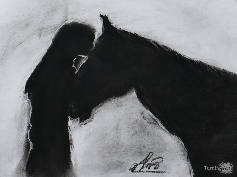 Alicia Lopez's work depicts a profound connection between a human figure and a horse, rendered in striking charcoal tones. The two subjects are presented in intimate silhouette, their heads gently touching, conveying a moment of quiet tenderness. Against a softly diffused, lighter background, the deep, velvety forms create a powerful contrast, emphasizing the emotional depth of the bond. Subtle highlights trace the contours, adding dimension to this evocative composition.