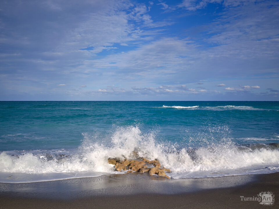 Dusk falls over the Coral Laden sandy beach on Jupiter Island in Florida as the tide begins to come up and crash onto the Coral mounds